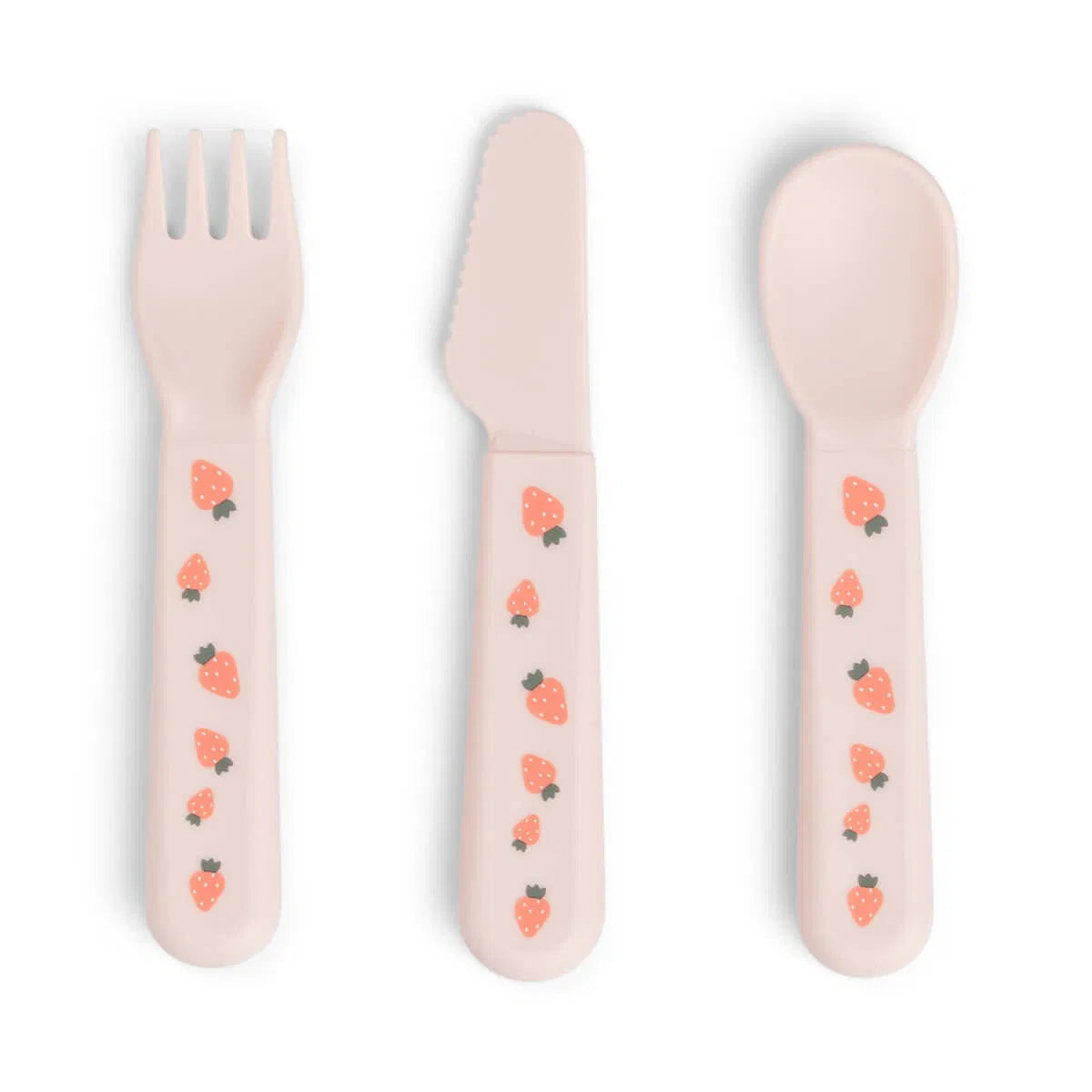 - Sød pudderfarve med jordbærmotiv- Bestik med bløde, afrundede kanter, der er sikkert for dit barn at bruge