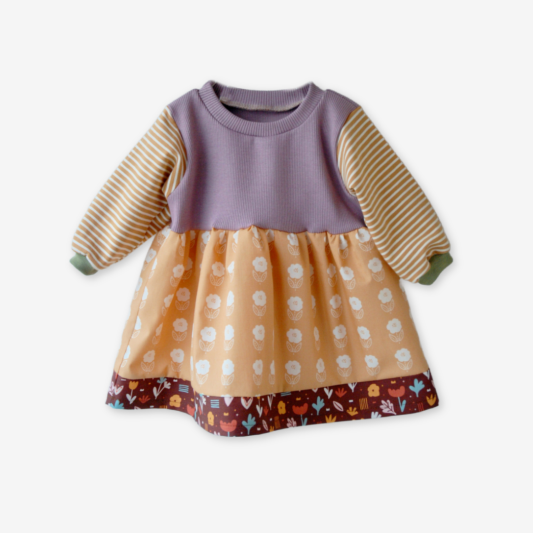 En helt unik kjole syet på vores egen systue på Amager – skabt i et fint mix af striber, ensfarvet og blomstrede stoffer.