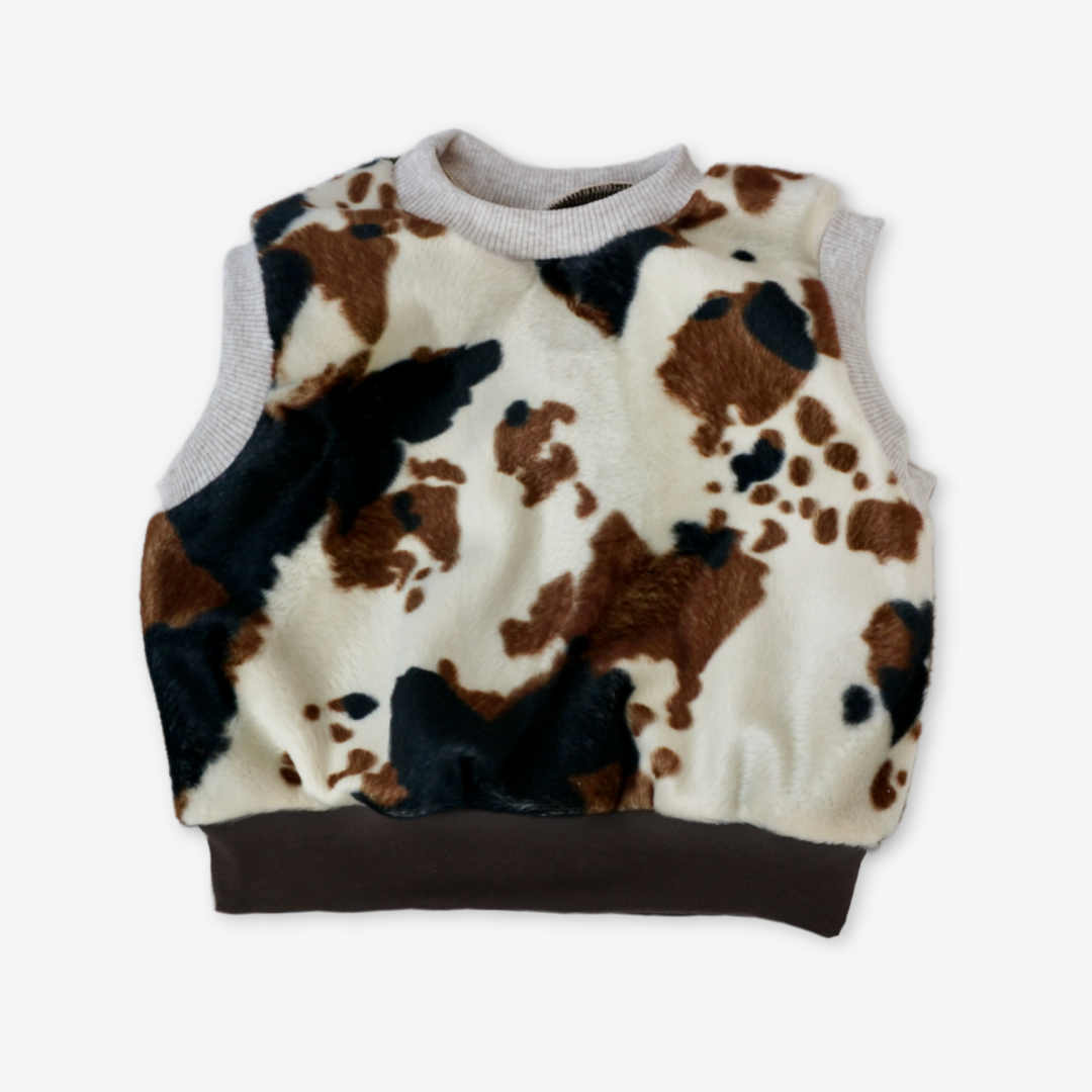 Vesten er syet i fleece lavet af genbrugsflasker og ko kunstpels i 100% Polyester