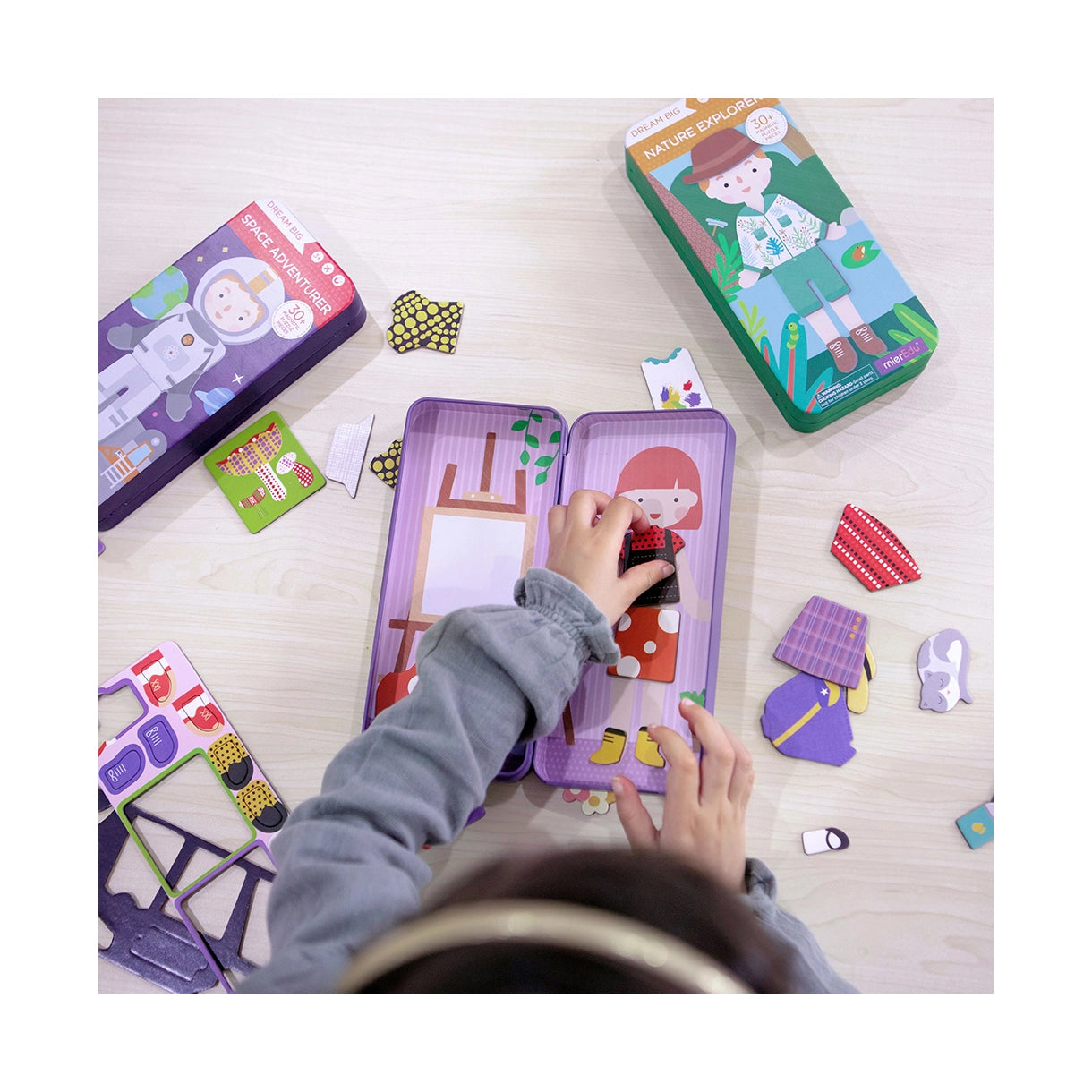 Dette magnetiske legesæt med kunstner-tema indeholder to baggrunde og mere end 30 magnetiske brikker til at sammensætte sin egen figur og finde på sjove historier.