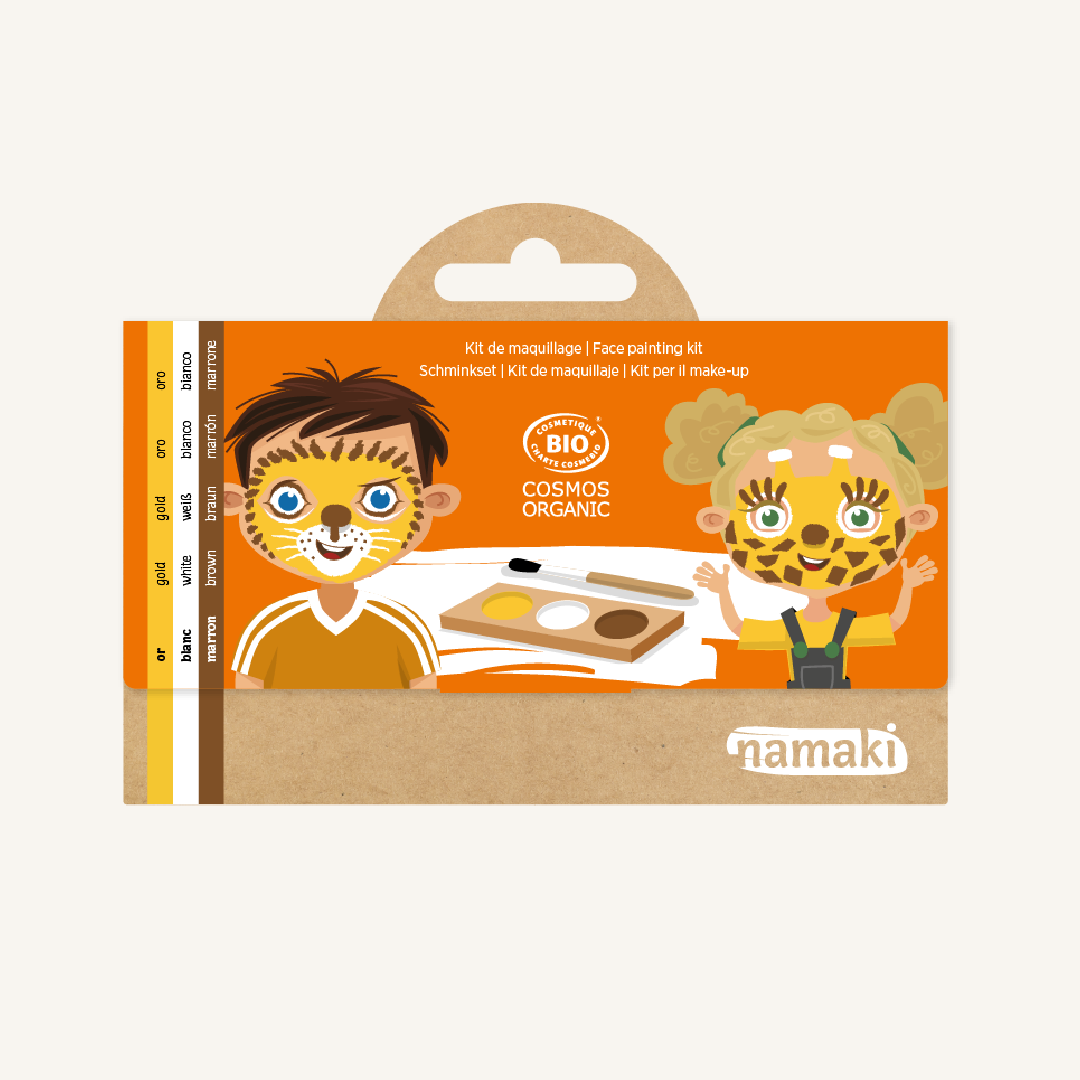 Namaki ansigtsmalingspakke, hvor dit barn kan forvandle sig til en sej løve eller en sød giraf. Ansigtsmalingen er vandbaseret, økologisk certificeret og hypoallergen – udviklet specielt til børns sarte hud.