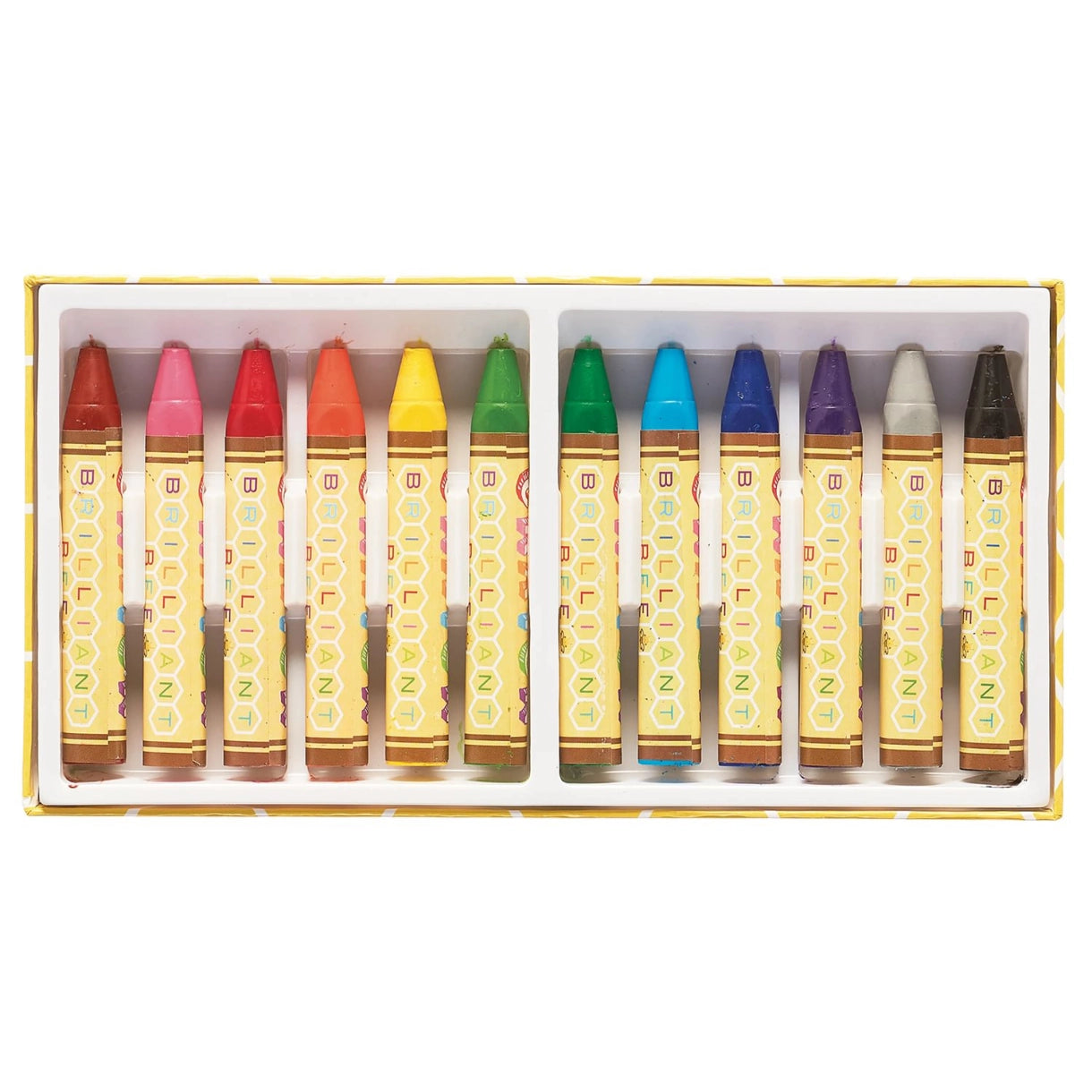 Sæt med 12 bivoksfarveblyanter fra Brilliant Bee Crayons-serien, perfekte til kunst, skole og kreative projekter. Trekantede stifter, så de ikke ruller væk.