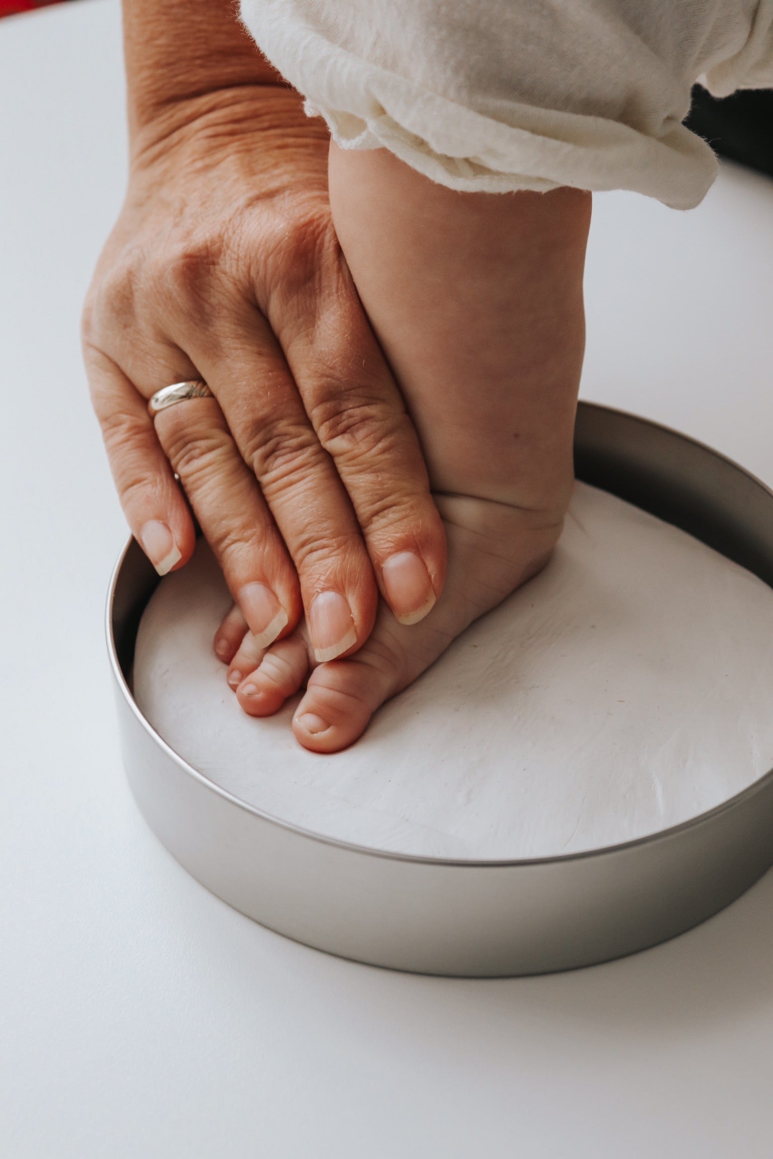 Instruktioner: Hold posen lukket indtil brug. Blødgør leret ved at ælte det i to-tre minutter, eller indtil det er blødt og alle luftbobler er væk. For at undgå at leret klistrer til overfladen anbefales det at anbringe det på plastikfilmen fra posen. Rul leret ud med trærullen til en tykkelse der passer til tinæsken. Tryk forsigtigt barnets hånd eller fod ned i leret og lav et aftryk. Når aftrykket er lavet, skal det overskydende ler skæres væk så aftrykket passer til tinæsken. Anbring ler-aftrykket i boksen og lad det lufttørre på en flad overflade. Lad aftrykket tørre i 2 dage på et køligt sted. Når leret er tørt, kan tinæsken placeres i akrylfoden eller bare i tinæsken til minde om det særlige øjeblik