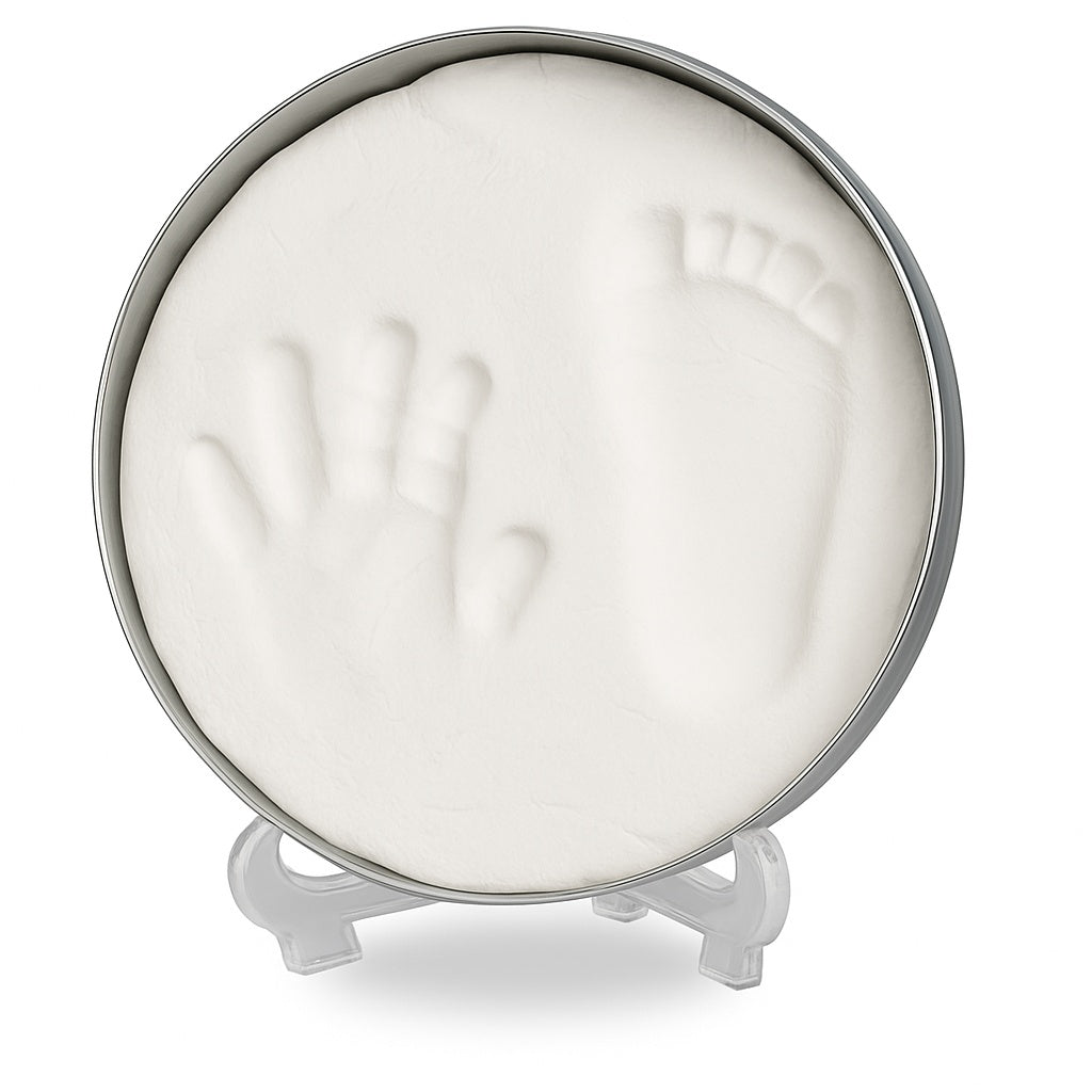 Komplet sæt med alt hvad du har brug for til at kunne lave et aftryk af barnets fod eller hånd derhjemme! Resultatet er et vedvarende og smukt minde, perfekt til dit eget hjem eller som gave.